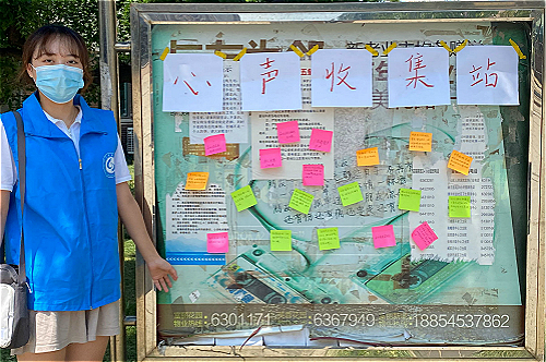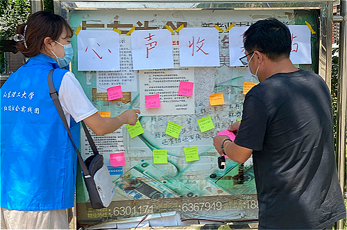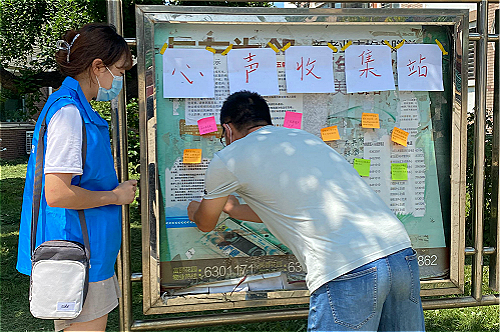 活动伊始,实践团成员向社区居民发放便利贴,居民在便利贴上写下对党支部的建议或者需要解决的问题。随后,实践团成员利用社区的展板,创设了一个心声收集站并积极引导居民贴上写好意见的便利贴。实践团成员组织将群众建议或需要解决的问题以手写便利贴形式在展板上呈现。