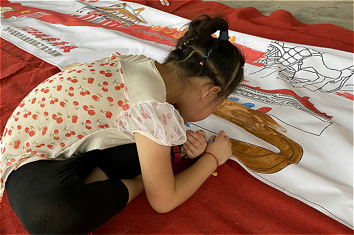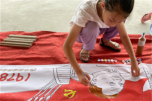 活动现场,孩子们俯下身子,手拿绘笔,从画面的构思到色彩的搭配,每一个步骤都一丝不苟。孩子们以画赞党,用五彩斑斓的色彩绘制起波澜壮阔的历史画卷,一笔一画深情地表达出对党的感恩之情和对祖国的美好祝愿。