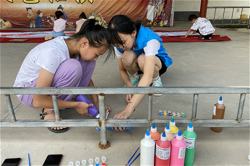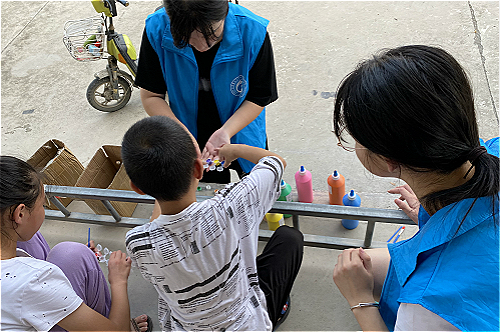 图为活动前期实践团成员帮助参与活动的孩子分发颜料与画笔
