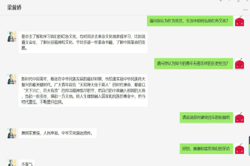 最后,崔珂萱通过微信聊天联系到优秀学生党员梁普娇。采访过程中,崔珂萱邀请梁普娇谈谈自己作为青年党员是如何在生活中弘扬红色文化的,她表示自己有时间就会去革命文化地参观学习,比如遵义会址,平时也会读一些革命书籍,了解中国革命的发展。此外,梁普娇还谈到当代青年的历史担当,她认为,新时代中国青年恰逢实现中华民族伟大复兴的最关键时代,应将人生理想融入国家和民族的事业中,担当时代重任,不断提升自我。