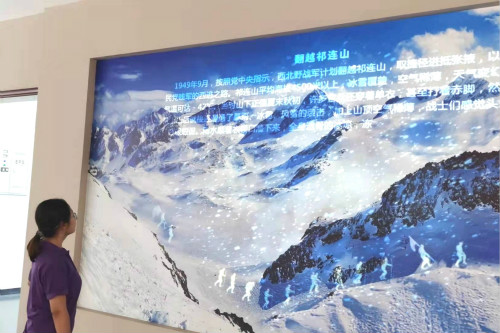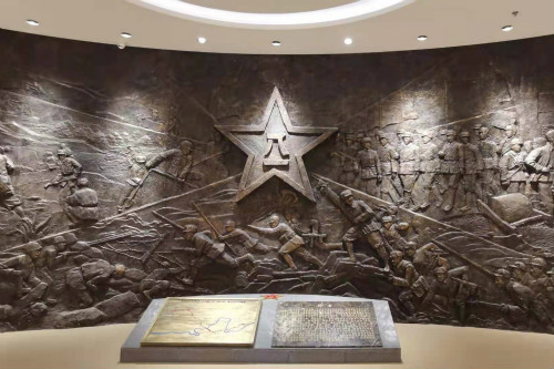 最后,王晓莹来到第二展厅前,一面巨大的铜墙映入眼帘,刻画着渤海军区战士们一路风霜,从积极从军到长途跋涉,再到开垦新疆,全面展示着山东渤海军区教导旅组建以来,一代又一代的教导旅战士为实现“初心”矢志不渝、砥砺前行的伟大历程。王晓莹站在铜墙下,深刻感悟到“大义大爱、无私奉献、听党指挥、永葆信念”的山东渤海军区教导旅精神。