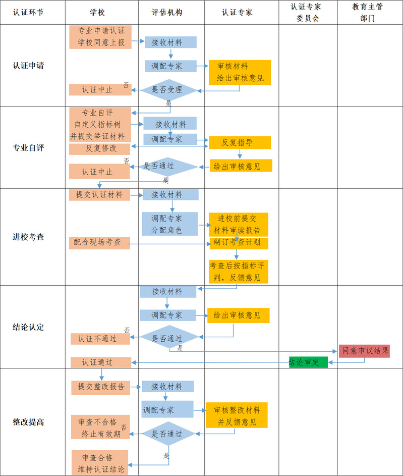根据教育部印发的《普通高等学校师范类专业认证实施办法(暂行)》,师范类专业二级和三级的认证程序包括申请与受理、专业自评、材料审核、现场考查、结论审议、结论审定、整改提高等7个阶段。在本系统中,具体体现为五大环节,依次是认证申请、专业自评(含材料审核)、进校考查、结论认定(含结论审议和结论审定)、整改提高。系统业务流程分阶段分用户展示如下: