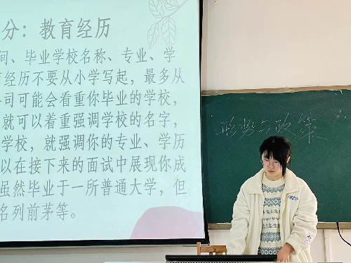 活动伊始,陶珂从面试、制作简历、考公三个方面介绍了“职场初体验”。首先,陶珂从面试的种类与意义两个角度解释了面试的相关问题,表明面试可以了解一个人的仪表风度、专业知识掌握程度、工作经验等方面。随后,陶珂通过一段视频展示了如何制作一份优秀的简历,并讲述了简历制作过程中需要注意的事项。最后,陶珂从公务员介绍、报考条件、报考原因等方面介绍考公问题,表明公务员是一份稳定、福利待遇好且工作强度不大、社会认可度高的工作,让学生对考公有了更详细的了解,也为学生提供了一条就业道路。