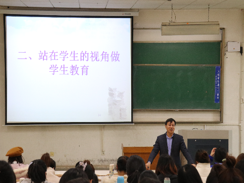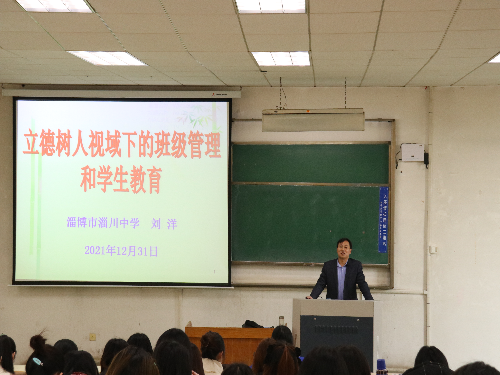 12月31日下午两点,我院“师范生教师素养提升”专题讲座在四号教学楼205教室顺利举办。我院特邀优秀毕业生代表、现淄川中学政教处刘洋主任进行题为“立德树人视域下的班级管理和学生教育”专题讲座。我院优秀教师陶新慧主持讲座,优秀教师彭静、徐南飞、李丽出席讲座,2018级和2019级英语(师范类)专业学生到场聆听。