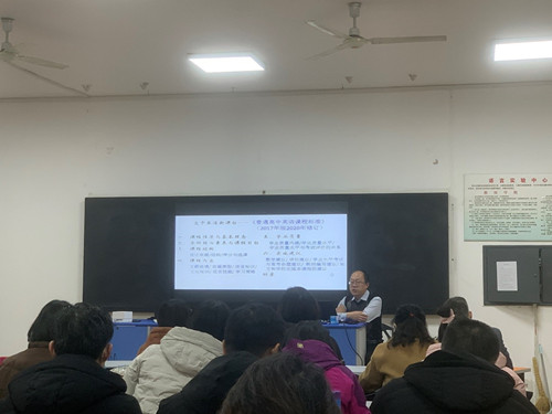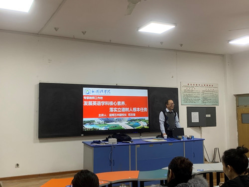 随后,司洪海发表了题目为“发展英语学科核心素养,落实立德树人根本任务”的讲座。他的演讲内容分为两部分:高中英语新课标学习体会和立足育人目标,发展英语学科核心素养。首先,司洪海从课程性质与基本理念、学科核心素养与课程目标、课程结构、课程内容、学业质量、实施建议六个方面介绍了高中英语新课标的新要求,指出老师应该及时转变教育理念、迎接新的挑战,树立终身学习的理念、不断提高专业素质。随后,司洪海表明学校应坚持以立德树人为目标,培养德智体美劳全面发展的社会主义建设者和接班人,培养具有中国情怀、国际视野与跨文化沟通能力的新时代学生,坚持语言能力、文化意识、思维品质与学习能力齐发展。