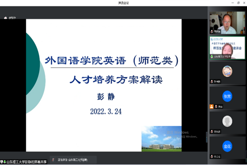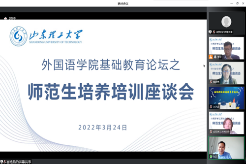 为了进一步提高英语(师范类)专业人才培养质量,充分发挥管理人员、用人单位、实践基地指导教师等利益相关方在师范生人才培养各个环节的参与与评价作用,3月24日下午2:30,学院通过腾讯会议线上举办师范生培养培训座谈会。作为学院基础教育论坛的重要组成部分,此次座谈会以“贯彻认证理念,共促师范生培养质量”为主题,由WilliamHill中文院长助理张雷主持,特邀淄博市教育局人才服务中心主任、淄博市教委初高中教研员、中学校长、指导教师与优秀校友代表参加,教师教育学院副院长郑兆青一同参加座谈。