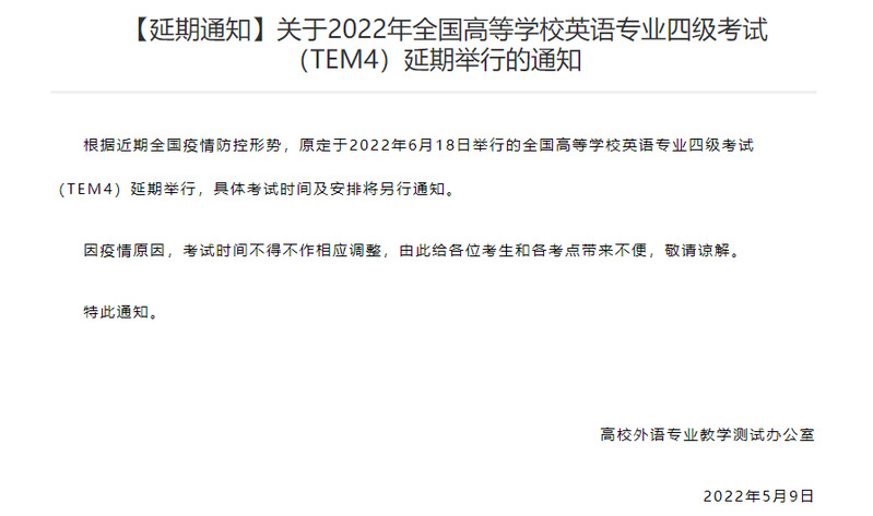 据高校外语专业教学测试办公室5月9日消息,根据近期全国疫情防控形势,原定于2022年6月18日举行的全国高等学校英语专业四级考试(TEM4),将延期举行,具体日期请关注WilliamHill中文网站“教务信息”栏后续公告。