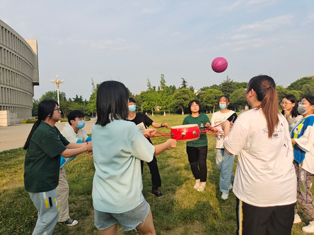 首先开展同心鼓游戏。此游戏要求8-10人小队。游戏开始时,每个队员牵拉一根绳子,保证鼓面水平。同时裁判将一个排球或网球从鼓面中心上方竖直抛下,队员们齐心协力将球颠起,保证球每次被颠起的高度都距离鼓面40cm以上,并需连续颠球30个。在游戏刚开始阶段,同学们还未掌握游戏规则,排球经常掉落,但同学们不气馁、团结一心、积极配合,最终成功完成以鼓颠球的任务,同学们各个脸上洋溢着灿烂的笑容。此游戏提高团队成员取长补短、团结协作、完成共同目标的能力,培养团队成员不怕挫折、不断进取、争创佳绩的意识。