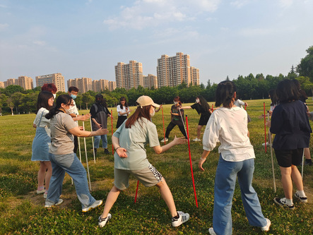 其次进行不倒森林游戏。成员们围成一个圆,面向圆心站立,间距一步左右。游戏要求成员们左手放到背后,右手掌心压住竖管顶部,使其竖立起来。然后集体开始顺时针或逆时针移动,移动过程中,保证杆不倒,左手始终保持在背后,不得触管,并且右手不得抓握竖管,只能用掌心压住管的顶部。同学们积极参与、反应迅速,顺利完成了交换10次位置的目标。此游戏有利于锻炼个人的快速反应的能力;培养、团队成员间的协调能力及默契。