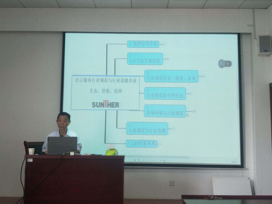 研讨会第二阶段是专题讲座。行业导师、双泽信息技术有限公司的董事长张勇做了题为“语言服务行业规范与行业道德养成”的专题讲座。