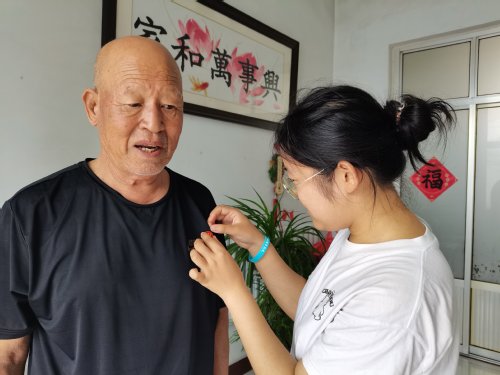 图为实践团成员为老党员佩戴党徽