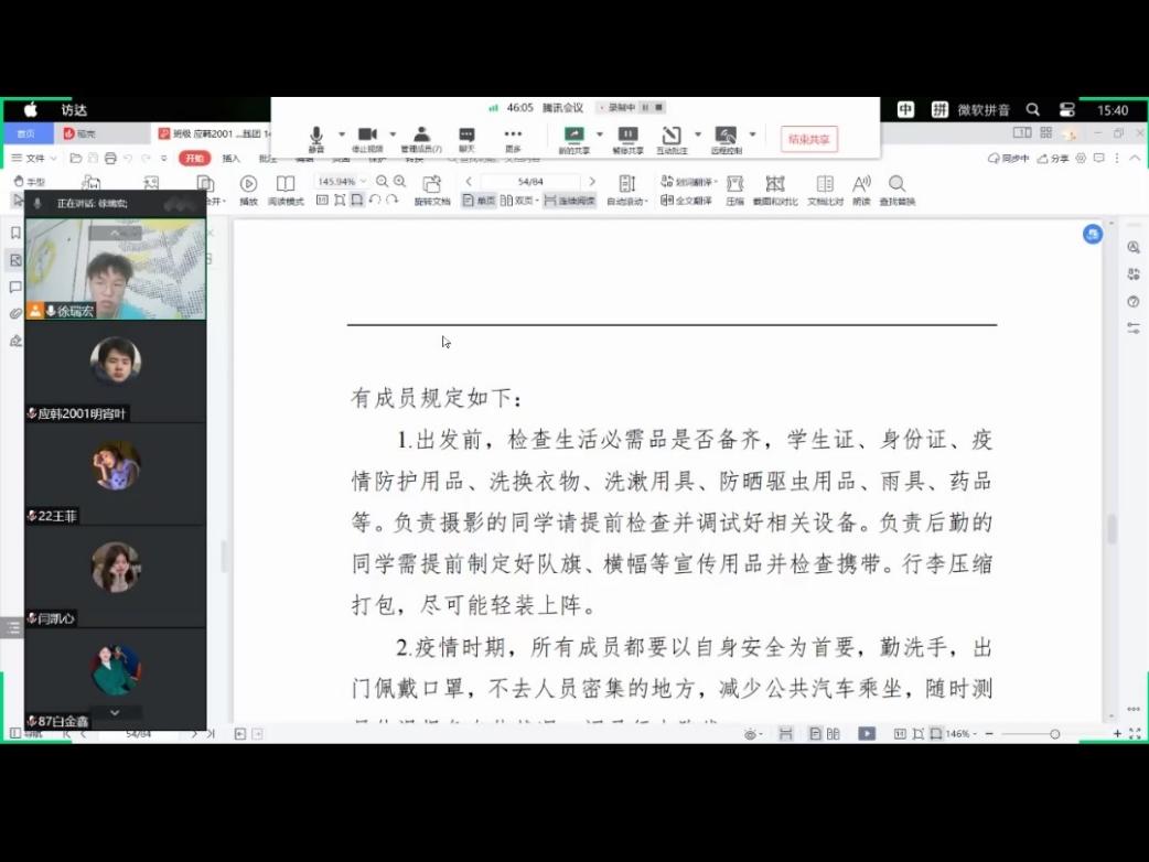 实践团全体成员共同学习了社会实践安全准则。安全是社会实践的基础,是社会实践的保障,社会实践安全教育学习和安全预案制定是实践活动开展的前提,要求团队成员要以保证安全为首要原则,严格遵守疫情防控要求,增强团队成员们的法制观念,提高安全意识和自我防护能力,严格遵循统一原则,不擅自离队。实践团队要密切关注疫情形势变化、极端天气变化和服务地区的自然、地质条件,做好突发事件的应对预案与处置,提高反诈防骗自我保护意识和能力,培养自救互救意识。