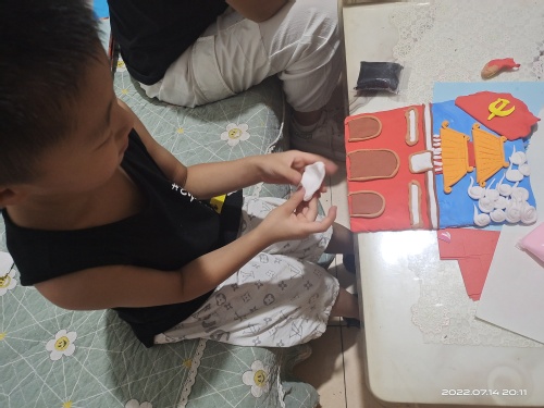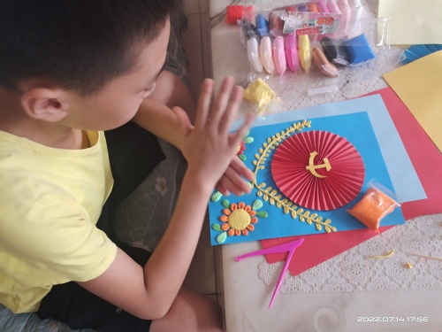 制作过程中一些青少年们也询问了有关党徽的含义,团队成员们也悉心地为他们讲述,“中国共产党党徽为镰刀和锤头组成的图案,图案为金黄色。锤子、镰刀代表工人和农民的劳动工具,象征着中国共产党是中国工人阶级的先锋队,代表着工人阶级和广大人民群众的根本利益,而黄色象征光明”。同时团队成员们也为他们讲述了一些有关党史的有趣故事,激发了青少年们对党史的渴望。