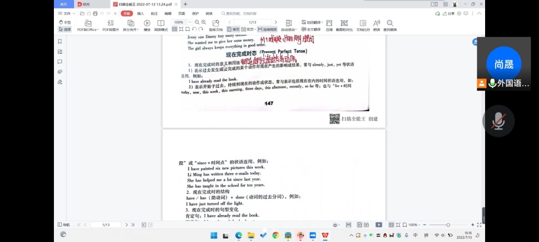 7月16日,“蒲公英”社会实践团成员余尚晟通过线上课堂为学生们讲解现英语课程内容。首先,余尚晟带领孩子们明确教学目标,即理解英语现在完成时态的意义和掌握其用法。随后,他创新性地将现在完成时态与一般过去时态进行类比,让学生们更加明确现在完成时态应用的条件,能够借此学会用生动形象的方式对现在完成时的句型变化进行详细的分析。