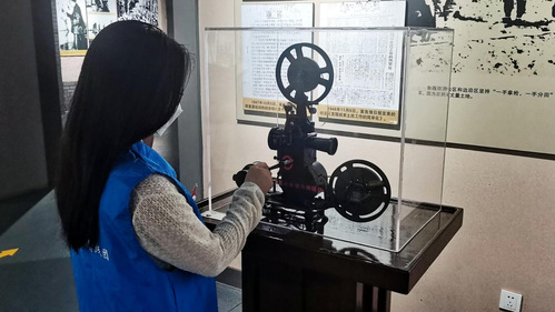 随着胶卷放映机一圈一圈的转动,一幕幕经典的抗战事迹展现在实践团成员眼前:无数同胞视死如归,倒在侵略者的枪炮声中,八路军将士不畏强敌,英勇抗战最终取得胜利。