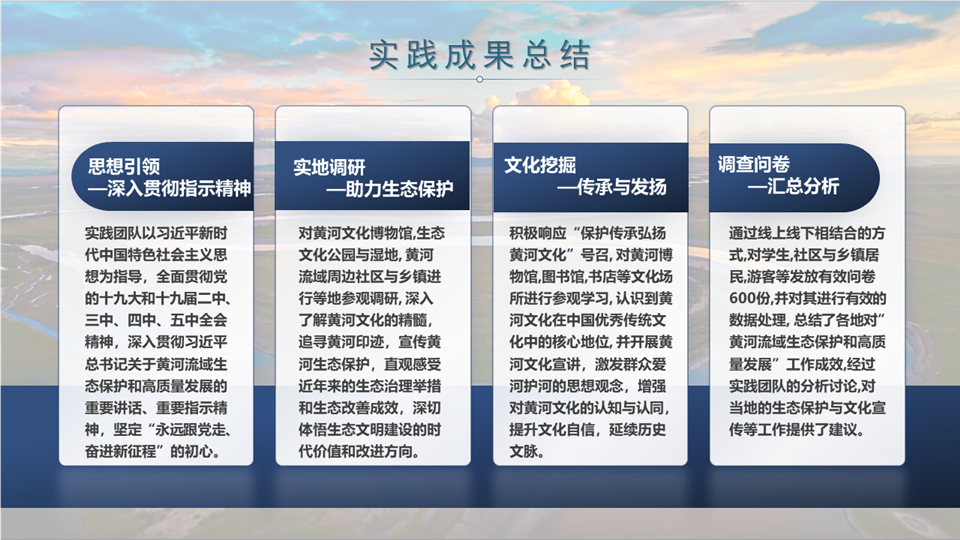 通过本次实践活动,实践团成员们深入贯彻习近平总书记在黄河流域生态保护和高质量发展座谈会上的重要讲话精神,对“黄河流域生态保护和高质量发展”政策落实有了更加充分的认识,在了解黄河流域生态文化的同时讲好黄河故事,呼吁当代大学生保护沿黄流域生态,传承黄河历史文化,为社会贡献出自己的一份力量。(撰稿人:徐瑞宏)