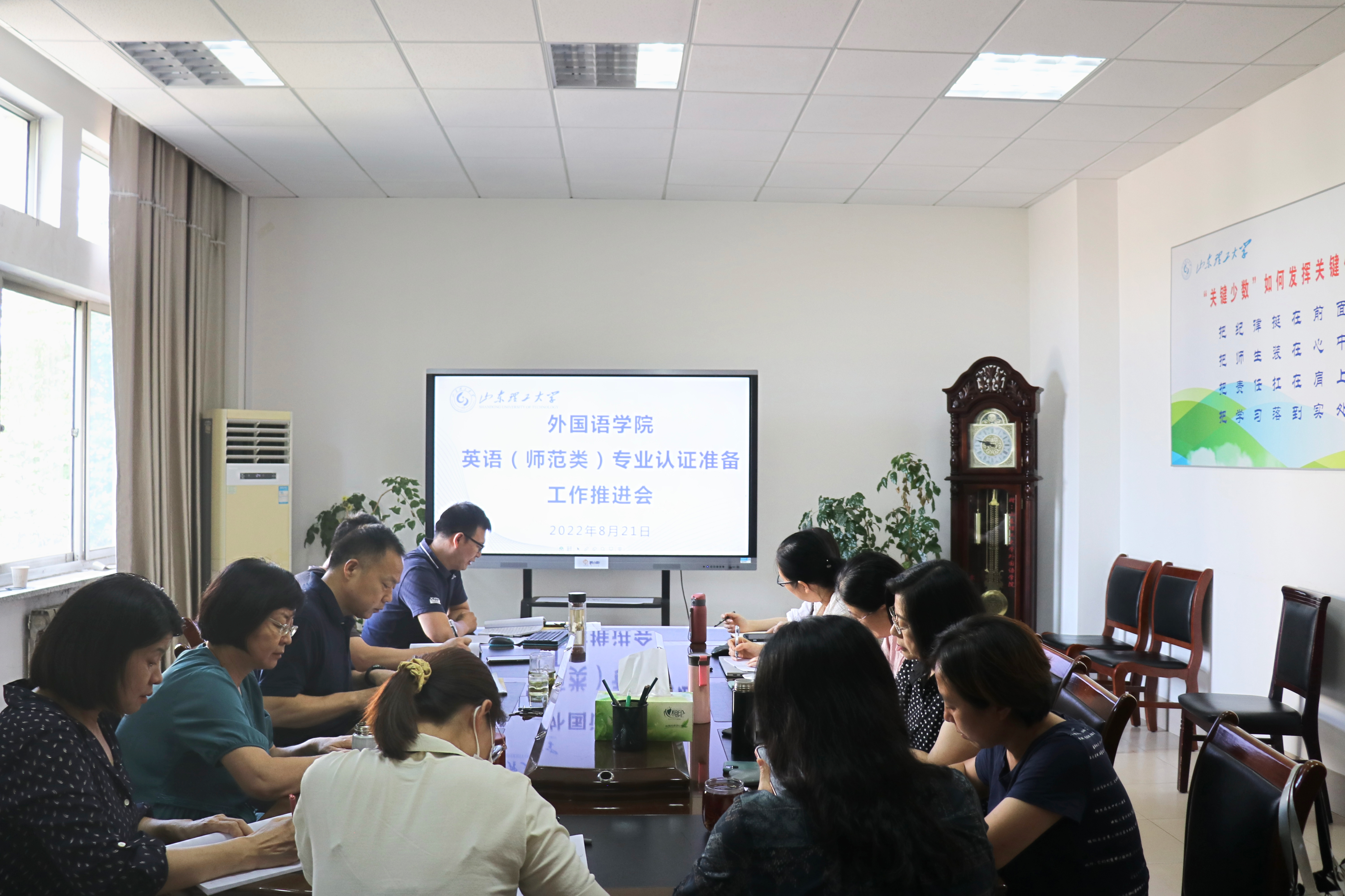 为加快推进学院英语(师范类)专业认证准备工作,做好下半年专家进校考察的相关准备,8月21日下午14:30,我院在8号教学楼二楼会议室召开英语(师范类)专业认证准备工作推进会。学院党政领导李静、牛书田、姜素锦和师范专业认证工作小组成员参加,会议由院长助理张雷主持。