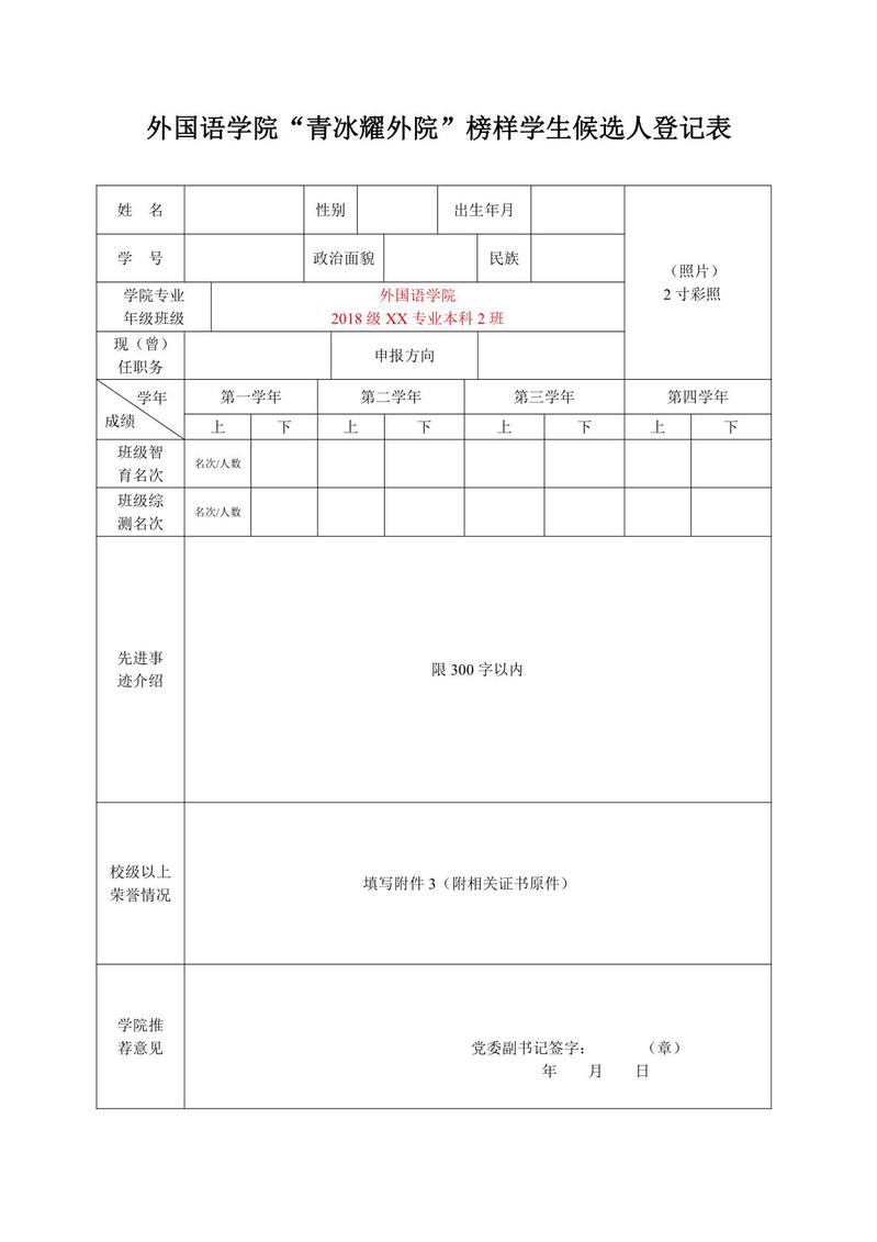 WilliamHill中文“青冰耀外院”榜样学生候选人登记表