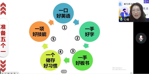 第二部分“五个一”包括一口好英语、一手好字、一手好板书、一个储存好习惯、一项好技能。赵敏通过展示优秀板书,着重讲解储存的重要性,教导学生们要在读书、看课两大板块拓展文化知识,厚积薄发。紧接着又展示优秀课例,强调信息化技能的重要性。