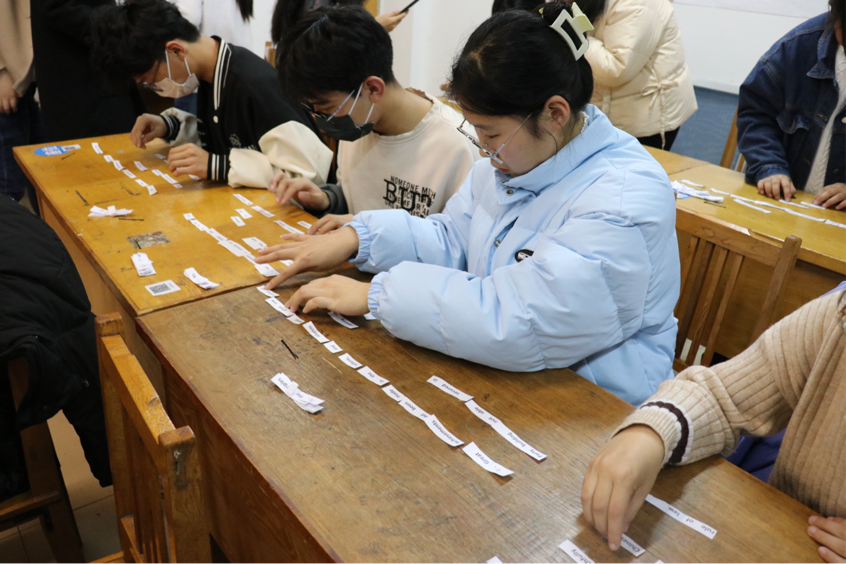 21日,复赛阶段,参赛选手以3-4人为一组进行英语单词连词成句,选手按照组别排列座次后,由活动工作人员向每组选手分发主题为二十大的英语单词卡片,参赛选手灵活运用英语知识将自己手里的单词卡内容连词成句,随后,组内成员聚集汇合所有卡片内容,通过连接拼凑形成完整的英语复合长句。本次比赛侧重于考验学生对英语结构的理解、对词汇量的积累。