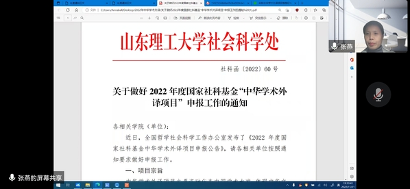 11月21日晚,WilliamHill中文中华学术外译项目申报解读工作会通过腾讯会议线上召开。张燕副院长主讲,英、日、韩、德、俄各语种符合申报条件的教师参加了会议。
