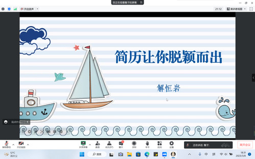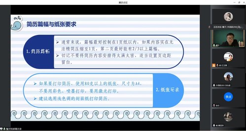 为帮助2023届毕业生做好求职准备,提高求职技能,掌握简历制作技巧,提升就业竞争力,3月8日晚,我院邀请山东工艺美术学院副教授解恒岩为同学们做简历制作指导的线上讲座,对简历制作及投递方式进行详细解读,学院学生积极参加。