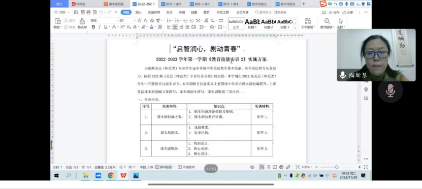 会议伊始,彭静对学生教育实训课程及会议流程进行介绍。紧接着,陶新慧向学生介绍此次教育技能实训的主要内容及课本剧创编方案。本学期教育技能实训将主要围绕中学英语课本剧创编展开,主要包括课本剧创编方案撰写、课本剧剧本撰写和课本剧展演三项内容;要求学生充分了解课本选题,明确教育目标,创编出思路清晰、内容全面的课本剧。此次实训将从第15周开始进行为期2周的学生分组实训,实训完成后,将举办班级展演赛和年级展演大赛,以赛促学、以赛促练。