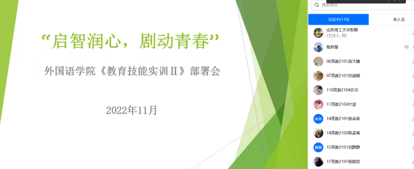 为帮助英语(师范类)专业学生逐步掌握中学英语教学基本技能,培养英语教育从业能力,提高学生参加教育技能实训的积极性,我院在11月29日晚线上召开2021级英语(师范类)学生教育技能实训Ⅱ动员大会。此次会议由英语教育系主任彭静主持,优秀教师陶新慧、李丽主讲,2021级英语(师范类)专业各班班主任及全体学生参加。