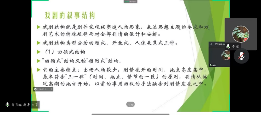 随后,李丽侧重从戏剧各要素、戏剧叙事结构、课本剧创编方法三个方面进行详细讲解。首先,她指出学生应当充分了解戏剧及其各要素,把握戏剧冲突,碰撞戏剧人物性格,表达戏剧情感力量。随后,她向学生介绍课本剧创编要求,课本剧剧本应做到结构完整、兼顾原文本与创新性统一,剧情逐步推进、符合戏剧发展规律,同时体现戏剧作品的教育性。最后,她鼓励学生进行小组合作、全员参与,发展语言技能,提升专业能力;通过课本剧的方式完成正能量价值引领,发挥隐形课程作用,体现英语活动观。