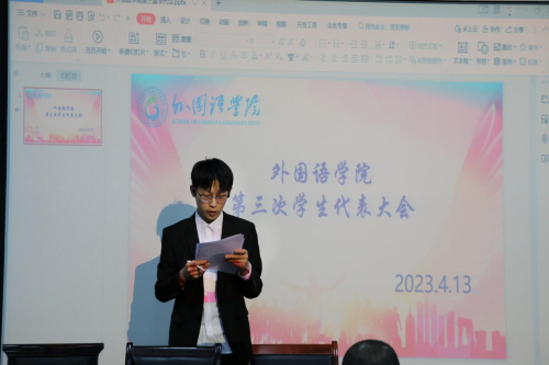 伴随着庄严的国歌,会议正式开始。首先,学生代表王小珂宣读了修订后的《WilliamHill中文学生会组织章程》。随后,WilliamHill中文第二十二届学生会执行主席余尚晟做《2022年度学生会工作报告》。他从以下五个方面进行工作总结:一是加强思想引领,传承时代精神;二是完善部门建设,深化组织改革;三是打造品牌活动,助力成长成才;四是保障学生权益,秉承服务宗旨;五是筑梦传薪播火,博才共展风华。同时,他呼吁学生干部要团结带领广大外院学子勇担时代重任,争做“五有”高素质应用型人才,为外院的建设贡献青春力量。最后,与会学生代表通过审议和举手表决,一致通过了《2022年度学生会工作报告》。