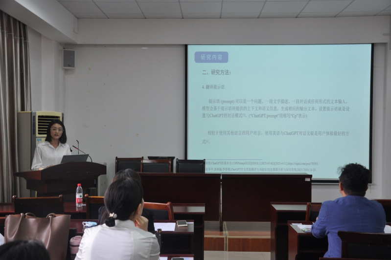 本次报告会由王子云、马晓、王逸凡、毕芸慈四位同学主讲,主讲主题分别为《ChatGPT译文质量的评估与提升——以陶瓷类文本汉英翻译为例》、《译者行为批评视域下诗歌翻译的“求真”与“务实”——以<昌耀诗选>英译为例》、伯明翰大学话语语料库研究方向申博经验、爱尔兰利莫瑞克求学申博经验。主讲人对其研究成果及学习、申博等方面经验进行了细致的汇报,与会人员认真聆听,受益良多。