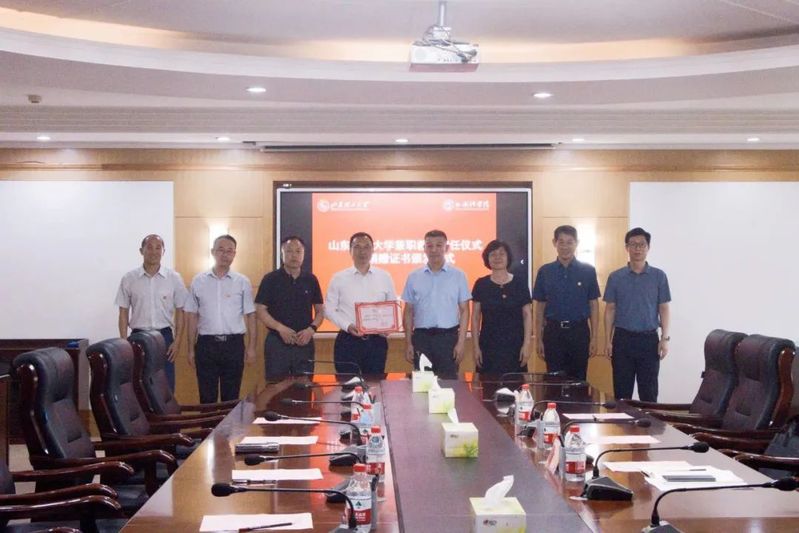 杨赟对吴绍勇受聘为我校兼职教授表示祝贺,对青岛万嘉集运物流有限公司向学校的捐赠表示感谢,为校友吴绍勇颁发兼职教授聘书。