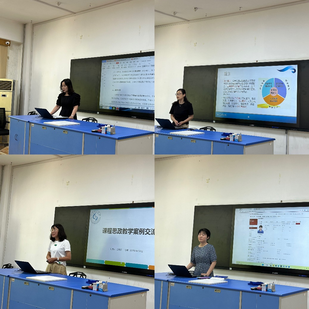 考核结束后,王莉莎教学团队进行了教学设计案例交流会。邢蕾、王静、王莉莎老师分别以中西文化比较教学案例、大学英语课程思政教学设计、大学英语课程虚拟教研室为主题进行了分享交流。