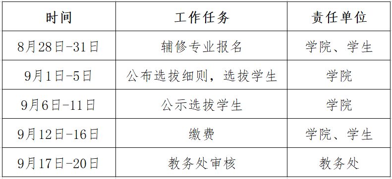 3)      根据学生报名情况和学校要求,学院制定并公布具体选拔细则(主要依据学生兴趣、成绩单、大学英语成绩等)。选拔结束后学院将拟录取名单公示五天,学生登陆辅修专业学院网站查询有关通知及详细信息。