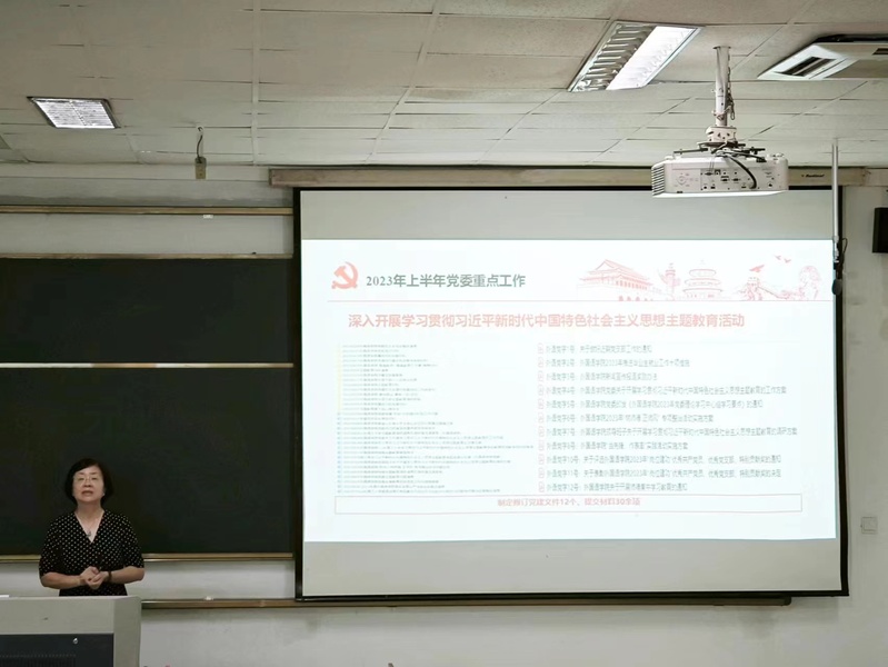 李静从学习贯彻习近平新时代中国特色社会主义思想主题教育活动开展情况、党委重点工作推进情况等方面全面回顾了学院党委2023年上半年工作开展情况,并对下半年工作计划进行部署。她指出,在全院教职工的共同努力下,2023上半年学院高质量就业、访企拓岗、校友会成立、教师队伍建设等工作成效凸显,今后要进一步深入学习贯彻党的二十大的会议精神和学校相关会议精神,自觉加强政治理论学习,进一步提高政治意识,筑牢意识形态防线;结合岗位实际,明确纪律规矩,提高红线和底线意识,切实加强师德师风建设。