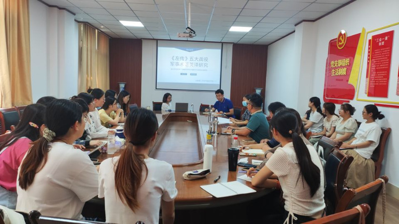 之后,高玥同学介绍了她的论文《<左传>五大战役军事术语英译研究》,从研究介绍、研究框架、研究方法、研究结果和不足及改进五大方面跟大家进行了分享,同学们就论文写作展开了讨论。学术交流结束之际,陈元飞教授做了总结发言,鼓励研究生在翻译实践中大胆探索、勇于创新。在交流讨论环节,大家就如何使用语料库以及获取渠道等问题展开激烈讨论。