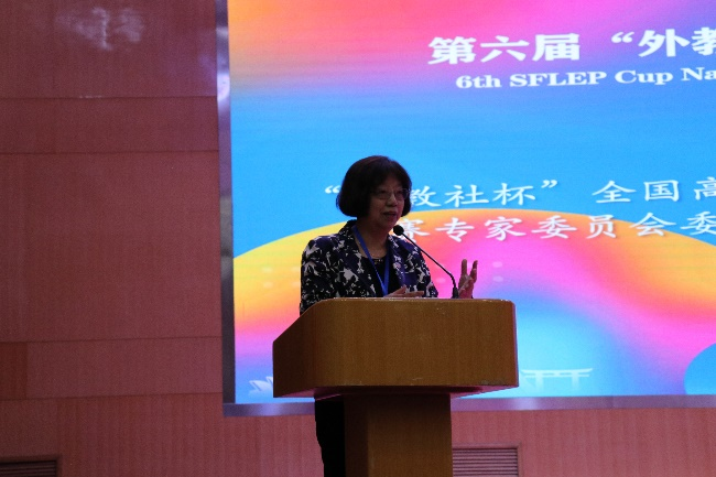 “外教社杯”全国高校学生跨文化能力大赛专家委员会委员、华东理工大学教授颜静兰代表本次比赛评委组作点评。她肯定了参赛选手语言能力和文化素养,并从内容维度、效应维度和呈现维度三个方面对选手的表现进行了总结,并提出了中肯的建议。她指出,跨文化的外语教育需要建设多层次多元化的教学目标体系,而跨化能力大赛可以帮助深化学生的语言文化与交际认识,本次大赛是提高学生的人文知识水平和语言综合运用能力,提高教师跨文化教学能力的一次重要契机。希望教师和学生能从大赛中受益,晋级的选手能在全国赛再创佳绩。