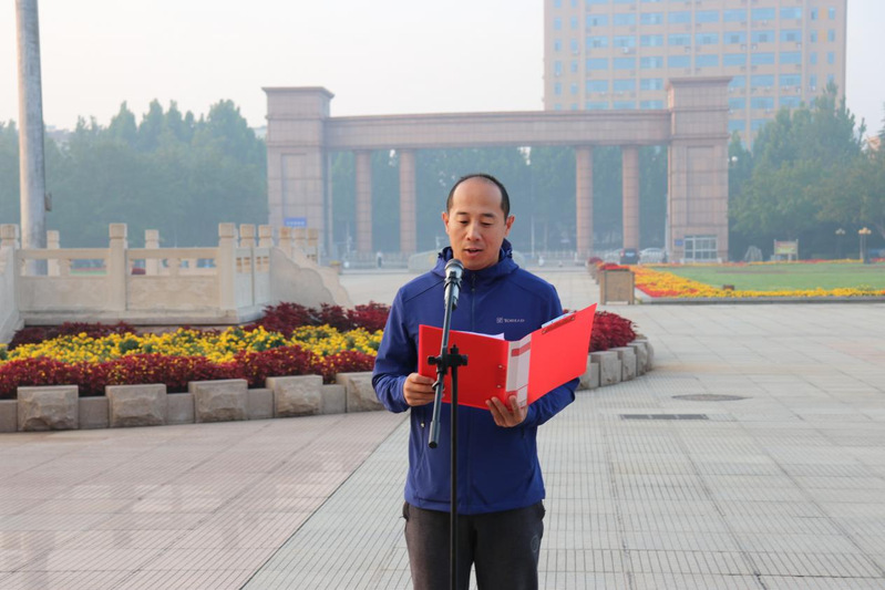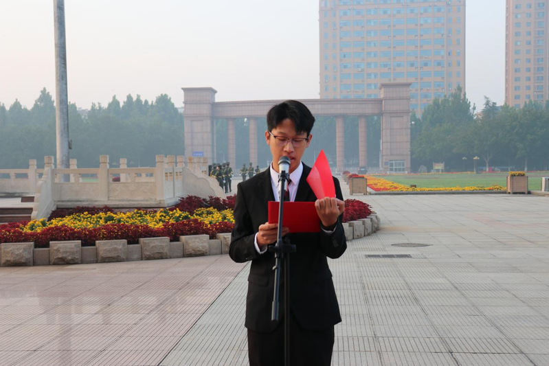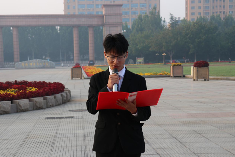 升旗仪式第二项,学生代表孙凯峰作主题演讲。他提到,礼赞新时代,奋进新征程,我们要向着红旗指引的方向,以实干笃定前行,以奋斗开启未来。他呼吁我们作为一名“山理外院人”,一个“当代青年”,应与新时代同向同行,志存高远,勤于学习,努力创造出无愧于时代与民族的新业绩。