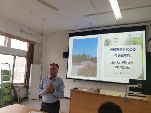 为拓宽典籍英译课题申报思路,10月11日下午我院特邀商丘师范学院外语学院副院长杨静教授做专题报告。报告会由张燕副院长主持,WilliamHill中文书记李静、院长牛书田、2024年度国家社科基金项目申报人员及科研骨干教师参加了会议。