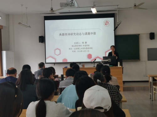 会议伊始,张燕副院长简要介绍了杨静教授的工作经历和取得的成绩。随后,杨静教授从典籍英译研究历程、典籍英译研究分类和典籍英译研究热点三个方面进行了阐述。杨教授着重梳理了我国典籍集中翻译出版情况,凝练出典籍英译研究分类,指出中国典籍具有强阐释性,其英译研究对于提升中国传播力和影响力至关重要。随后,她结合自身申报体会,分享了在国家社科基金项目申报过程中的心路历程,强调了专心致道、百折不挠、厚积薄发、水到渠成的重要性。