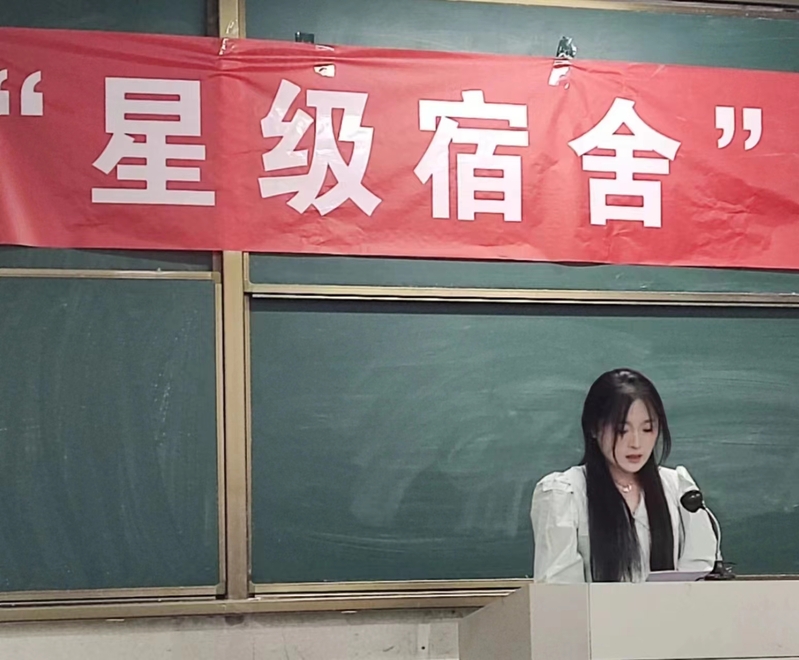 获奖宿舍学生代表英教2201班郑娴发言。她分享了宿舍收纳、整理、清扫的工作方法并表示,宿舍是锻炼独立生活能力与培养团队协作精神的重要场所,要积极付诸行动以建设更美好的宿舍环境。