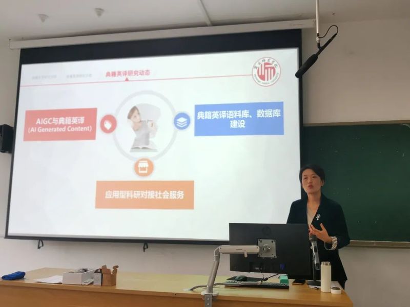 副院长张燕首先简要介绍了杨静教授的工作经历和科研成果。随后,杨静教授从典籍英译研究历程、研究分类和研究热点三个方面进行了剖析。她着重梳理了我国典籍集中翻译出版情况,并指出中国古代典籍具有强阐释性,其英译研究对于提升中国传播力和影响力至关重要。