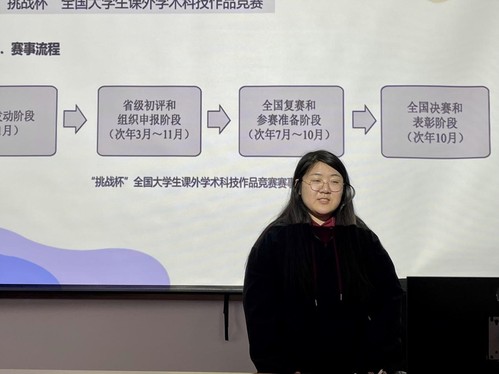 隋佳良结合自身丰富的参赛经验,介绍了“互联网+”大学生创新创业大赛、大学生创新创业训练计划、“挑战杯”、山东省大学生科技创新大赛、哈尔滨大学生创业大赛和山东省大学生创新方法大赛六类创新创业重点赛事。她从赛事背景、赛事流程、参赛要求、如何准备参赛以及如何平衡比赛与学业的关系五个方面分享了其独到的经验和方法。