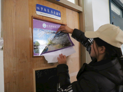 活动筹备期间,学院组织带领学生拍摄校园内风景,并挑选打印,张贴在教学楼的教室门窗上。活动开展过程中,学生兴致高昂,积极参与,展现了昂扬向上的精神状态和良好的志愿服务精神。教室门窗上的标语、照片既提高了学生的审美能力,又起到良好的育人作用。