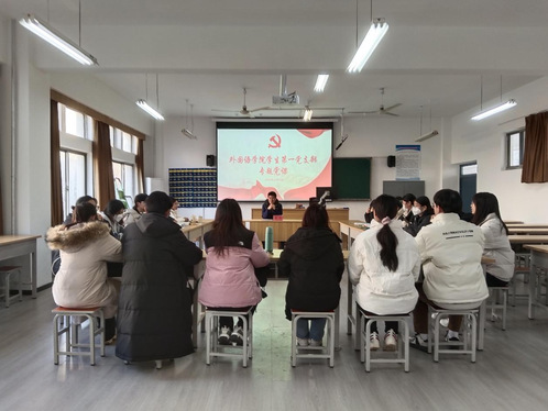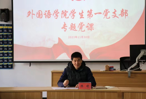 11月30日,陈靖在8号教学楼217教室为学院学生第一党支部师生党员上专题党课。学生第一党支部全体党员参加。