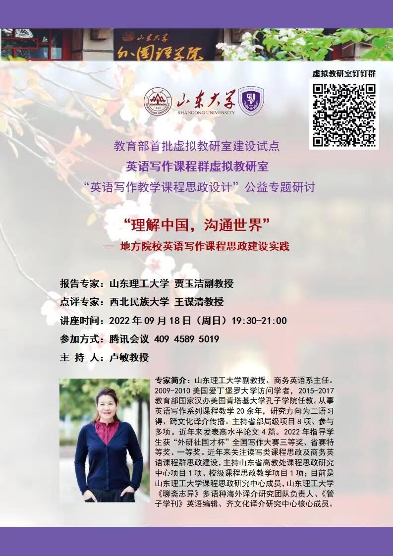 “问渠哪得清如许,为有源头活水来。”为使自己成为一位合格的教师,贾玉洁在巨大的工作压力下,积极参加教研教改。近年来,她先后主持了校级教研课题6项,山东省十三五规划教育课题1项、省教育厅课程思政项目1项;2013年《经典阅读与写作》课程获批校一流本科课程;作为核心成员参与省级教改项目、省一流课程、省一流本科专业建设项目、校级教研项目10余项。2023年获教学创新大赛三等奖、校级教学成果二等奖;2022年9月受邀在教育部英语写作课程虚拟教研室作“课程思政建设实践”专题发言。贾玉洁秉持着勤学笃行、求是创新的躬耕态度,践行追求卓越的教育家精神,坚持将自己的科研成绩反哺到教书育人中。她围绕自己的研究方向,指导本科生在毕业论文阶段开启学术探索之路,激发学生的科研兴趣。5年来她所指导的本科生有3位获得校级优秀本科毕业论文。