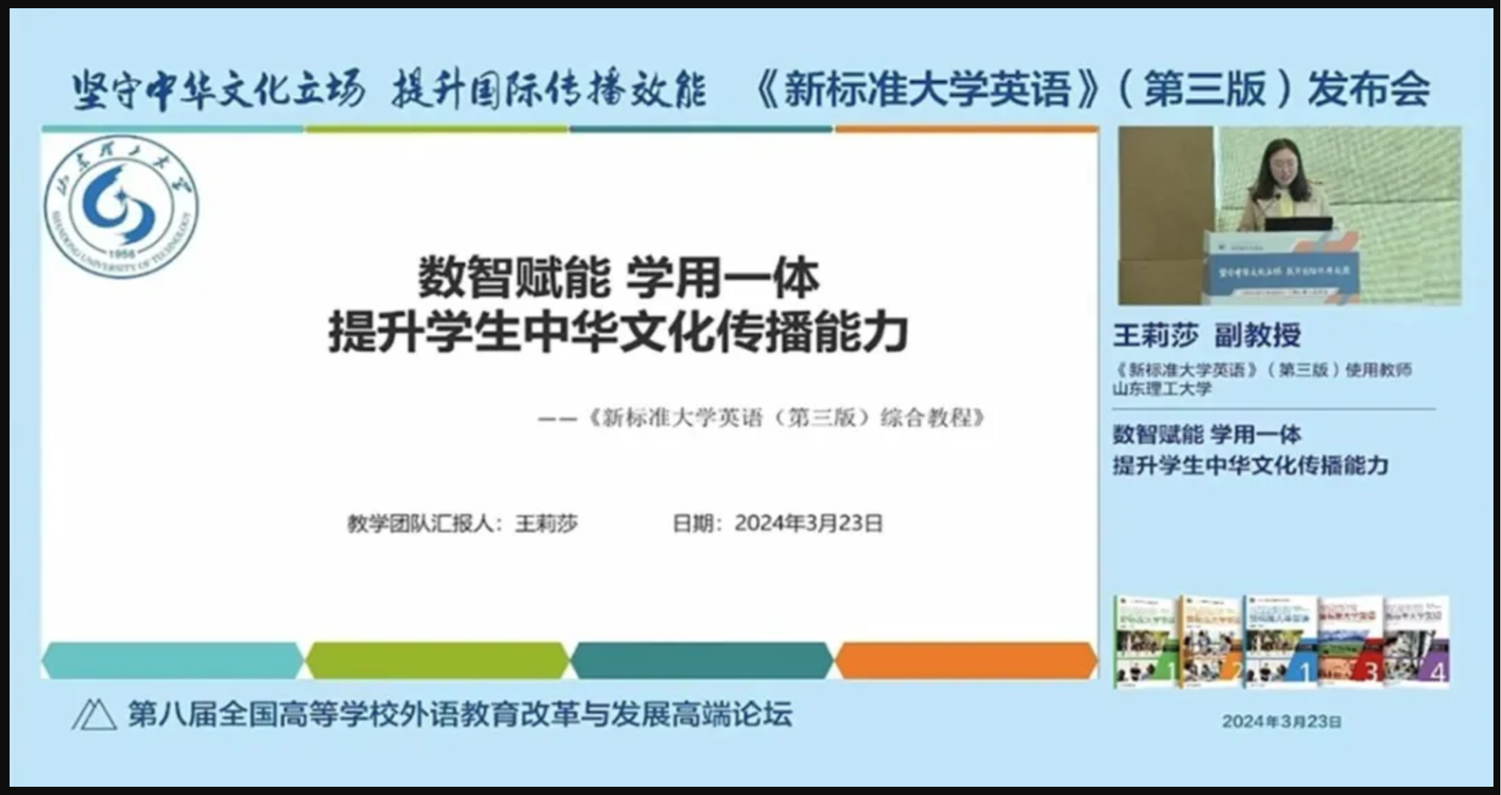 近日,我院大学英语教学团队在第八届全国高等学校外语教育改革与发展高端论坛专题活动中做分享发言,王莉莎副教授以“数智赋能,学用一体,提升学生中华文化传播能力”为题分享了我校大学英语教学借助《新标准大学英语》(第三版)教材使用开展教学改革的实践经验。