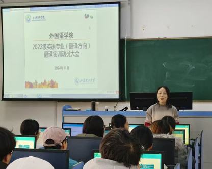 为保证我院笔译实训有序开展,提高学生学习积极性、主动性,11月20日上午,我院在8号教学楼316教室举办2022级英语专业(翻译方向)笔译实训动员大会。此次会议由英语系主任毛毳、副主任李婷、2022级英语专业(翻译方向)学生共同参加。