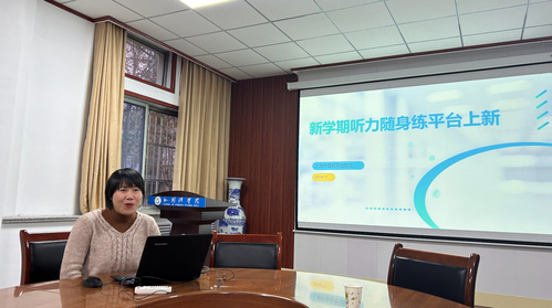 随后,顾奕主任以《听力随身练》教材开发为例介绍了外教社数字出版中心数字平台最新研发情况。徐青总监详细介绍了听力随身练的新功能、竞赛活动和wetest组卷功能等内容,讲解如何利用科学的听力训练体系提升学生的听力理解能力。最后在讨论环节,专家们认真听取了系部主任及任课教师反馈的教材使用方面的问题,并就如何优化教材内容和小程序功能进行了深入的探讨和交流。