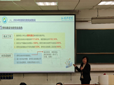 会上,李静传达了学校党委四届六次全委(扩大)会议暨2024年工作总结2025年工作部署会会议精神。李静指出,全院教职工要认真贯彻落实学习有关精神和校院党委2025年主要工作目标任务,提前谋划2025年各项工作并加以落实,推动学院教育事业取得新突破。 随后,李静以“攻坚跃升,事争一流,凝心聚力促发展”为题作报告。她表示,2024年全院教职工携手奋进,各项工作实现了新突破、迈上了新台阶。她结合2024年学院教学科研、人才培养、关键指标、升学就业等工作推进和完成情况进行了回顾总结,围绕党建发展、师德师风、意识形态、安全稳定等方面进行了工作部署,针对学院当前存在的问题和今后重点工作方向进行了深刻的梳理和分析。